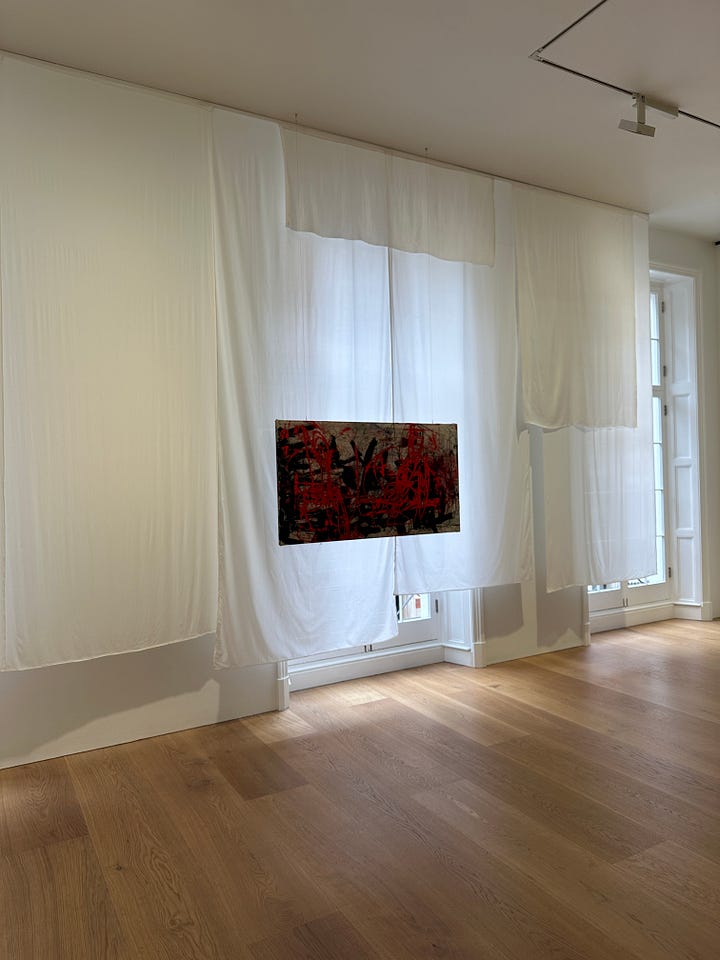 This solo is comparable to his amazing solo I saw in NY a couple of years ago. I especially enjoyed curation on the second floor with white fabrics ( curtains if you will) having in front of the windows creating a background for paintings instead of classic wall installation. I also love the free hanging canvas covered in doodles and little writings.